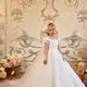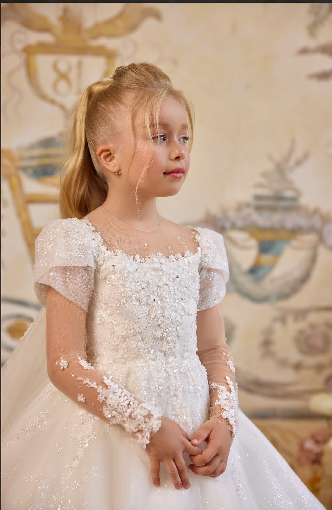 The bodice is adorned with delicate hand-applied floral appliqués and sequins, shimmering like a constellation under the night sky. Soft puff sleeves add a touch of romantic innocence, while illusion tulle sleeves trail with sparkling floral embroidery for an ethereal finish.
