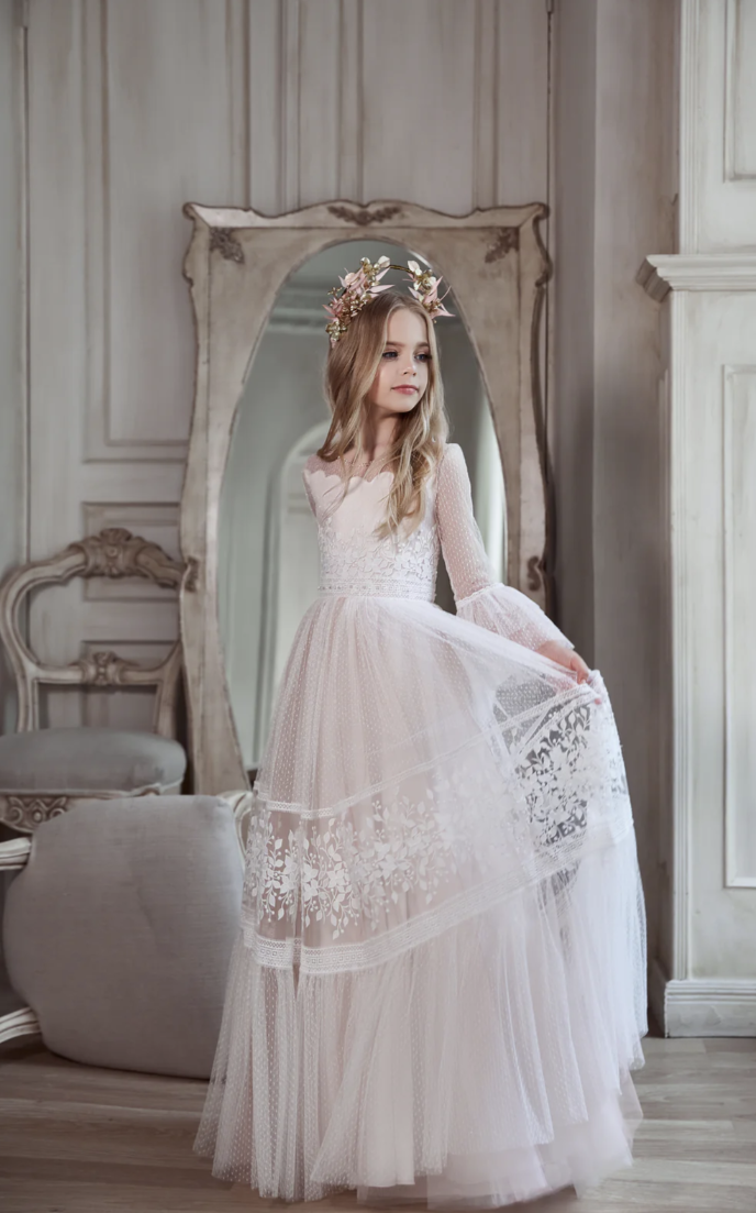 Complete the look with a floral or pearl crown and loose waves for a fairy-tale finish. Perfect for communions, flower girl moments, portrait sessions, or any occasion that calls for something truly enchanting.