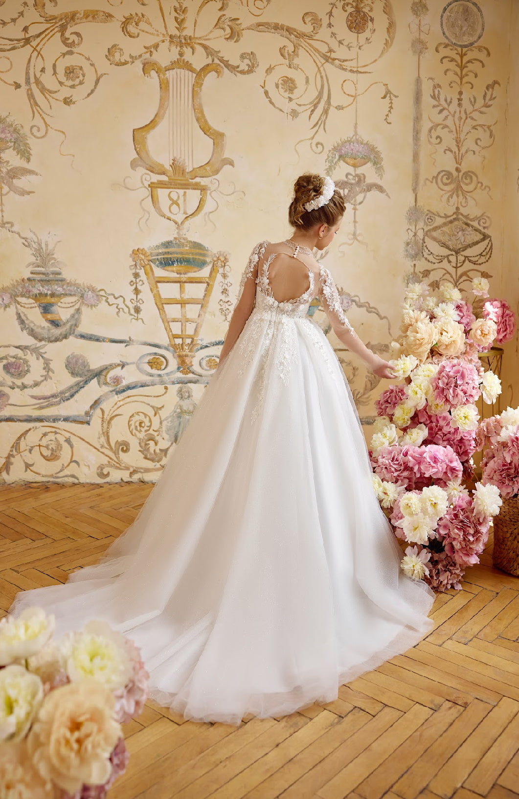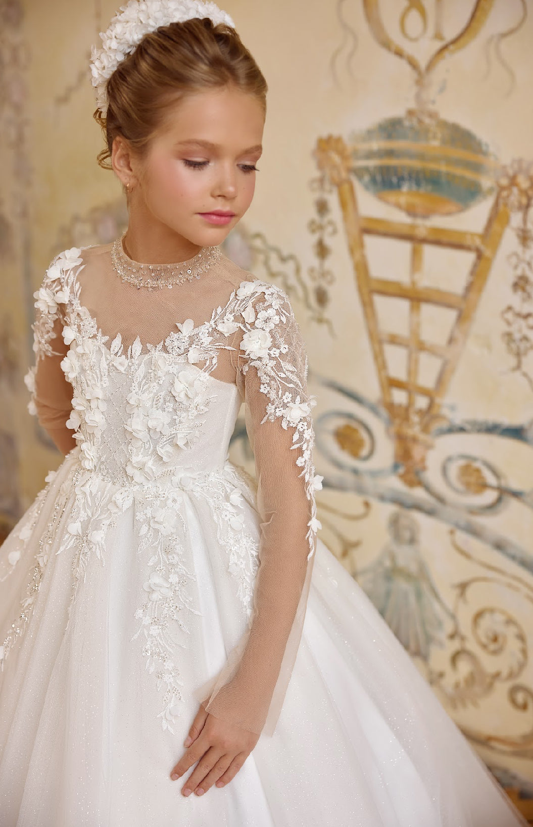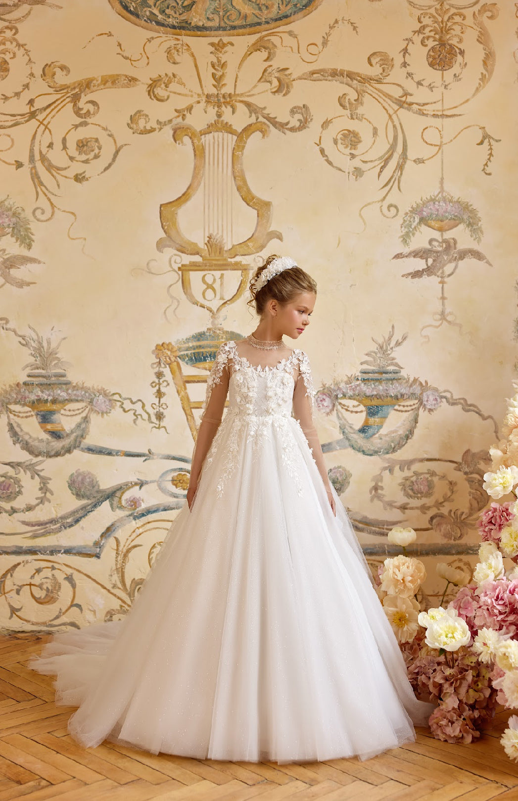 The Aurelia Gown is a masterpiece of elegance and grace, designed for little royals who dream of timeless beauty. Its illusion neckline and sheer lace sleeves are adorned with hand-sewn floral appliqués that trail delicately onto the bodice and down the skirt.