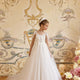 A graceful open-back keyhole design, framed with intricate lace and soft pearl accents, adds a touch of modern romance, while the flowing ballgown skirt cascades into a dreamy train. Each step sparkles softly, capturing the light with every twirl.
