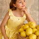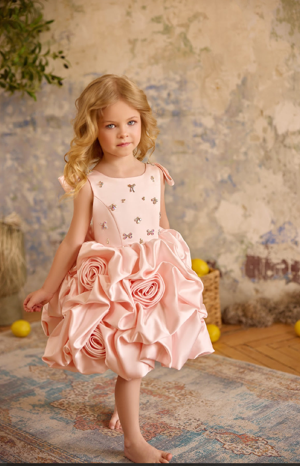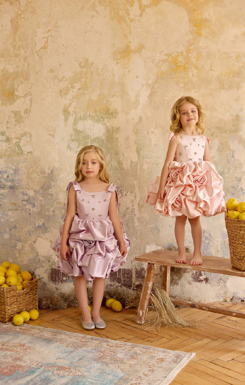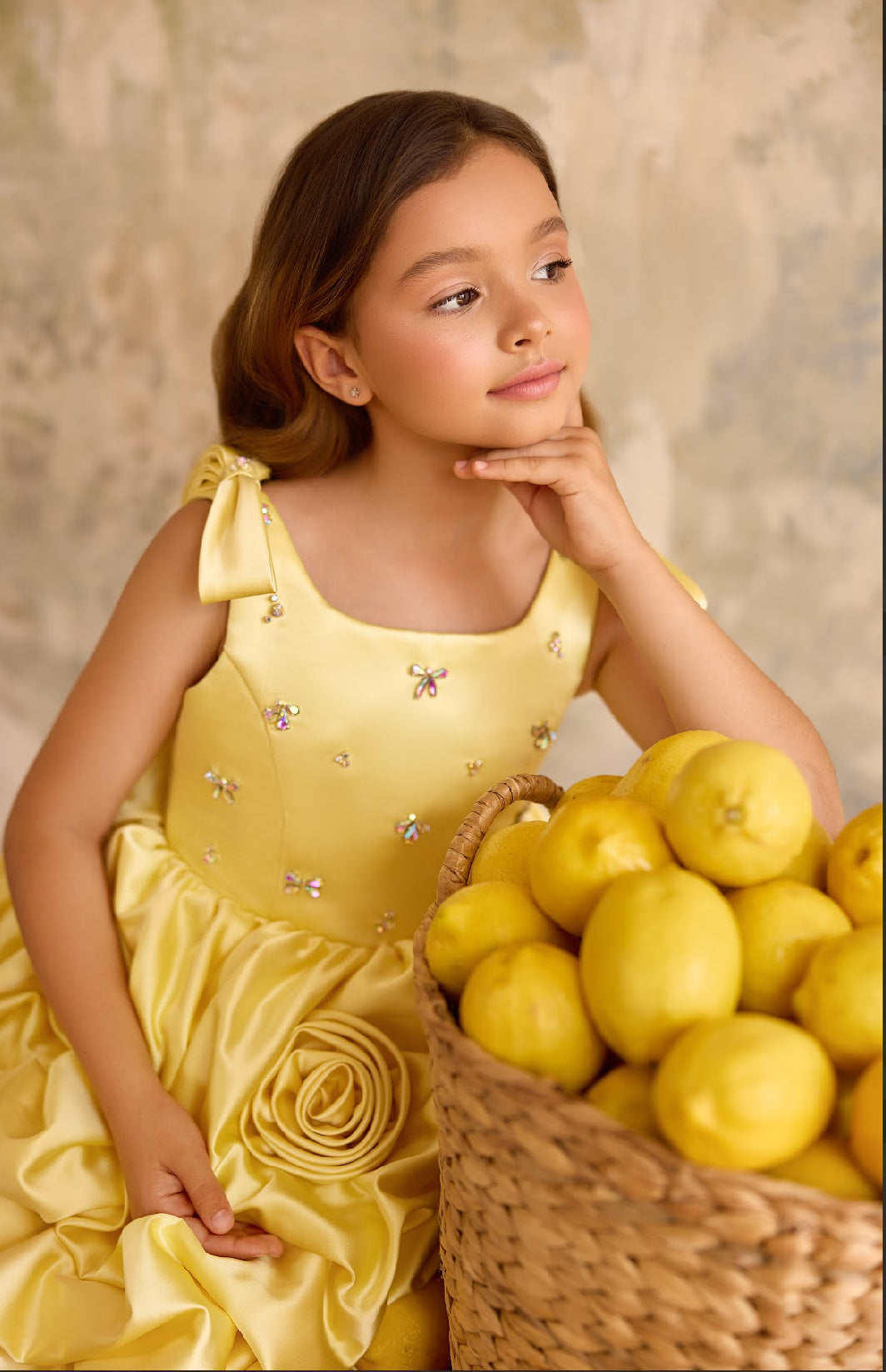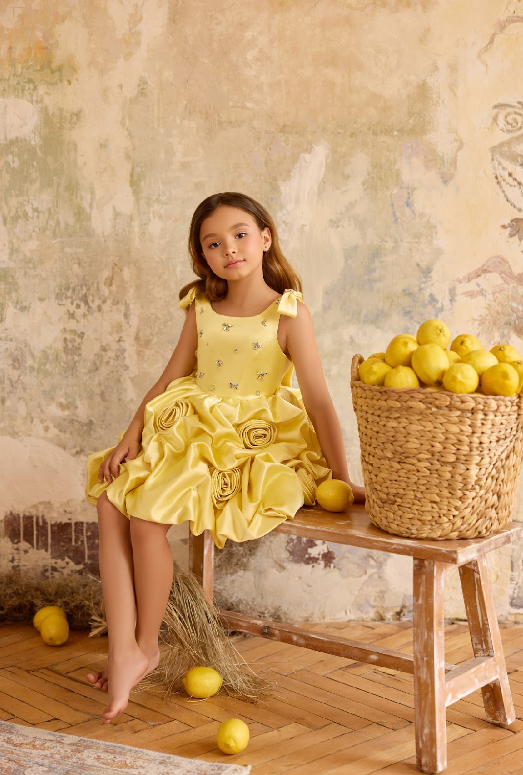 Its standout feature is the voluminous rosette skirt, artfully crafted from cascading satin folds that bloom into three-dimensional flowers. Available in an array of radiant colors — from soft blush and lilac to sunny lemon yellow — this dress allows every princess to shine in her favorite shade.