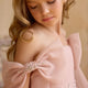 Step into a world of timeless elegance with the Rosabella Gown, a masterpiece crafted for your little princess. This couture creation blooms in layers of delicate blush tulle, cascading into a sweeping train that floats with every step. The bodice is adorned with hand-set crystals along the waistline, catching the light like morning dew on petals, while oversized bow accents at the shoulders add a touch of whimsical grandeur.