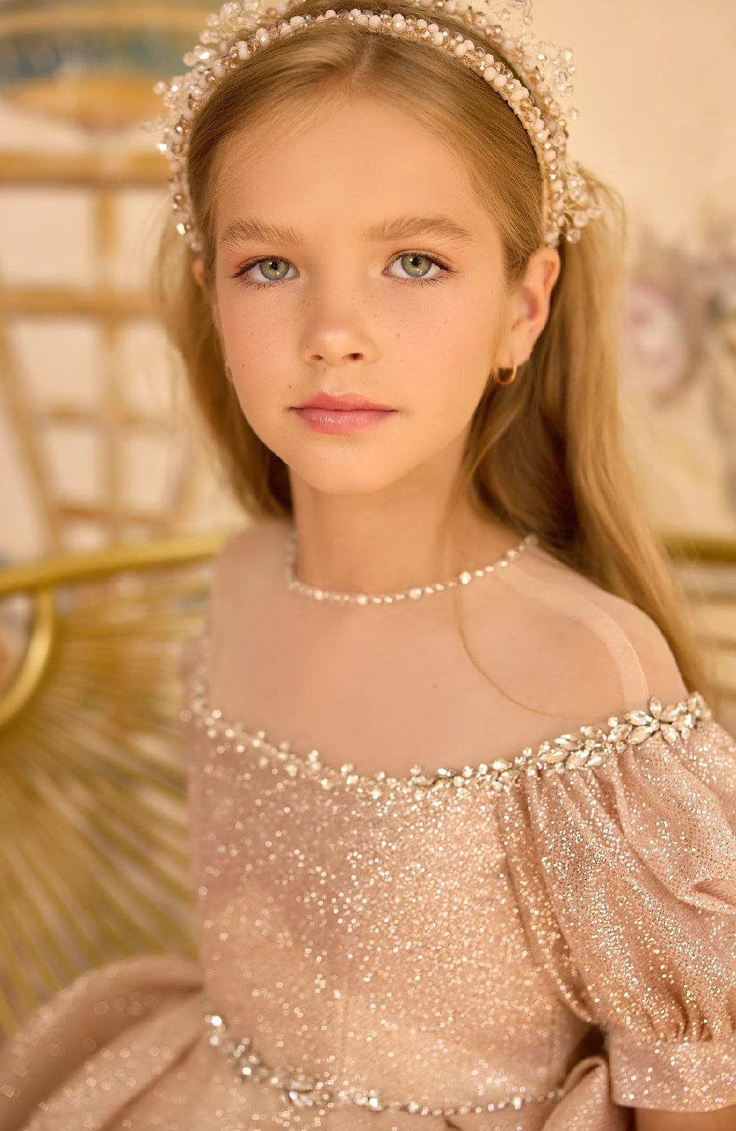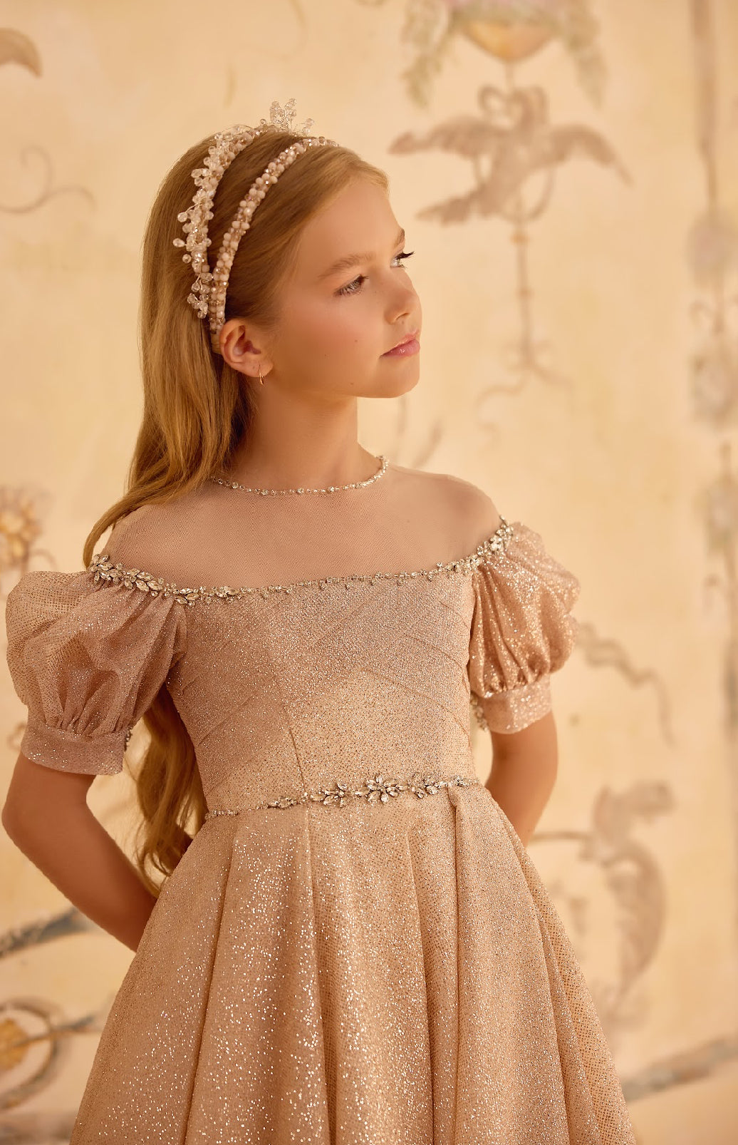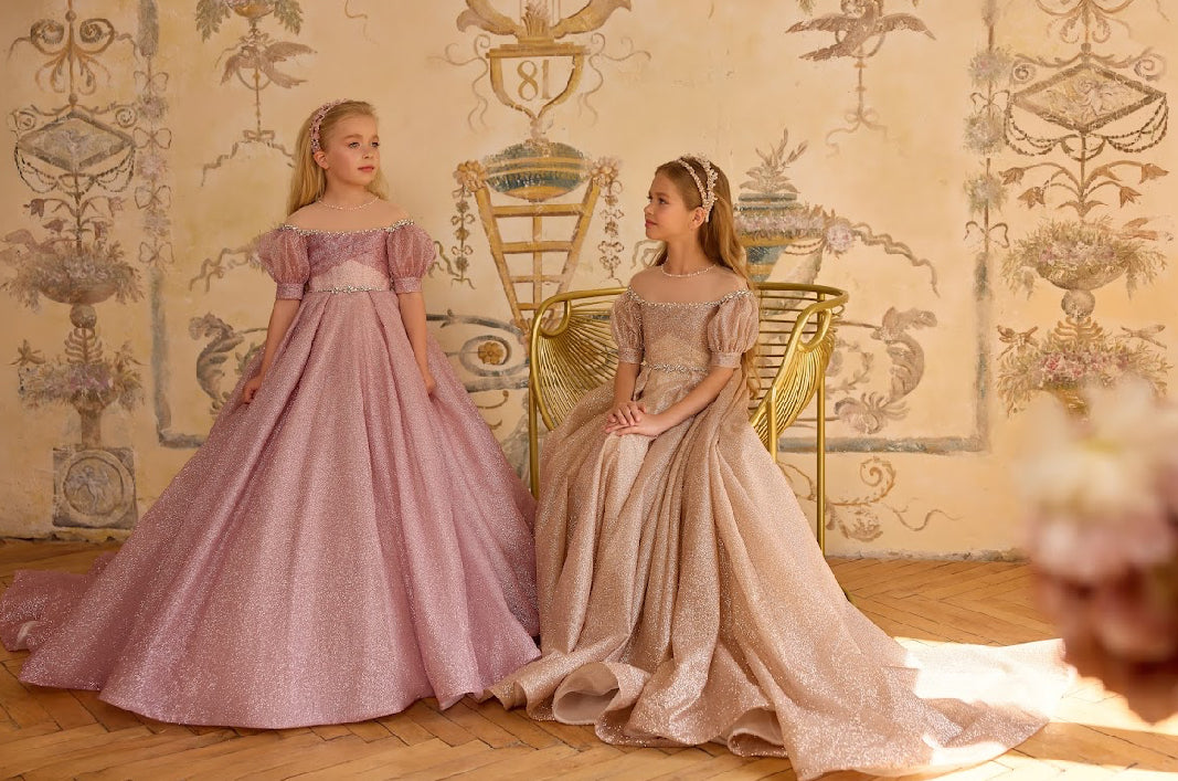 The off-shoulder neckline, adorned with jeweled embellishments, frames the shoulders with delicate sparkle, while the puffed sleeves add a touch of youthful romance. A crystal-accented waistline defines the silhouette, cascading into a voluminous, glistening skirt that sweeps effortlessly into a regal train.