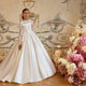 The Viviette Gown is a vision of timeless refinement and angelic grace. Crafted in luminous satin, its full ballgown skirt flows effortlessly into a regal train, creating a silhouette that exudes sophistication. The bodice is adorned with intricate lace detailing and sheer long sleeves, offering a romantic touch that balances tradition with modern luxury.