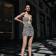 Hand-placed multifaceted stones create a reflective mosaic that catches light from every angle, giving the gown its unmistakably high-fashion presence. The structured mini skirt maintains its shape while offering fluid movement, allowing each step to shimmer with runway intensity.