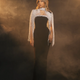 The sleek, body-skimming gown beneath anchors the look with refined minimalism, allowing the beaded cape-effect overlay to take center stage. Each strand sways with fluid movement, catching the light effortlessly and framing the body with soft, celestial draping.