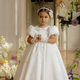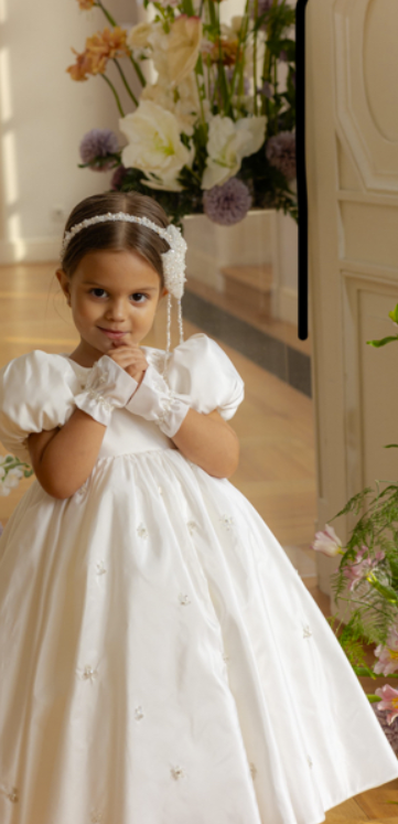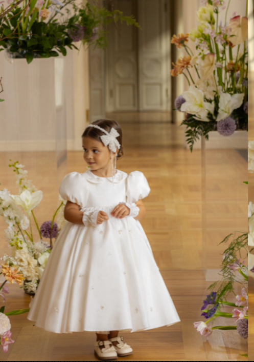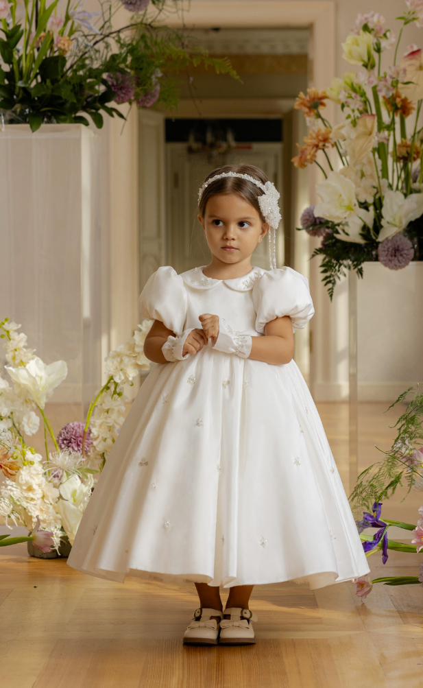 A true masterpiece of timeless charm, The Eloise Blossom Dress is designed for little princesses who embrace grace and elegance. Featuring a delicate Peter Pan collar, dainty puff sleeves, and a full, voluminous skirt adorned with shimmering pearl embellishments, this gown exudes classic sophistication. The intricate hand-applied floral details and soft satin fabric create a dreamy silhouette, perfect for flower girls, first communions, and special celebrations.