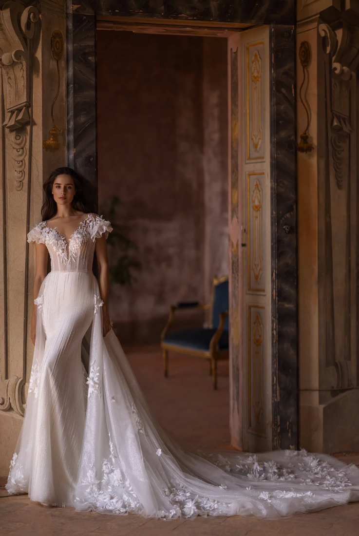 The detachable overskirt flows effortlessly into a sweeping cathedral-length train, intricately embellished with blooming 3D florals that trail behind like petals in motion. Whether worn with the dramatic overlay or styled in its sleek silhouette, The Fleur Élégante Gown transforms effortlessly from ceremony grandeur to reception sophistication.