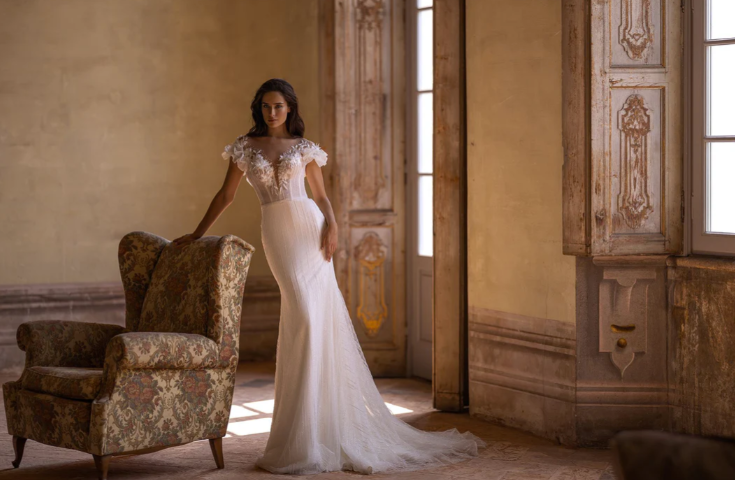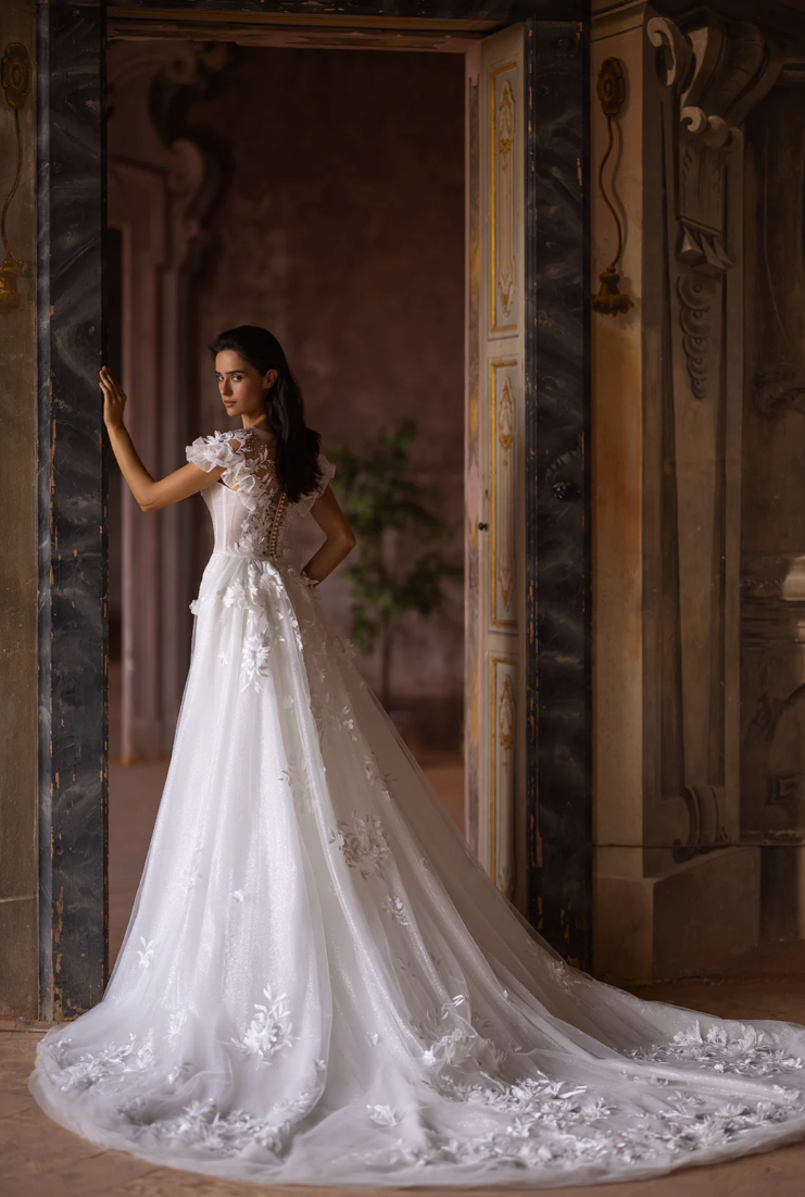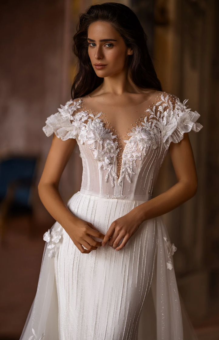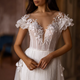 Pair this gown with delicate drop pearl earrings, a soft half-up wavy hairstyle, and a cathedral-length floral-trimmed veil for a look that radiates ethereal femininity. Perfect for a romantic garden wedding, a grand château celebration, or an elegant destination ceremony by the sea.
