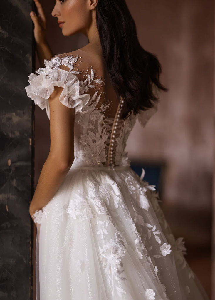 Step into a world of romance and timeless refinement with The Fleur Élégante Gown—an exquisite masterpiece designed for the bride who dreams in florals and walks in elegance. Crafted from shimmering silk tulle with soft linear embroidery, this gown features a captivating illusion bodice adorned with dimensional floral appliqués and hand-placed pearls that cascade delicately down the décolletage. The plunging illusion neckline, framed by ethereal ruffled sleeves, evokes a soft yet confident allure, while the structured silhouette embraces the body with gentle grace.
