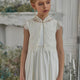 This classic First Communion outfit is a two-piece set. It includes a gown with a lace bolero. A full-length, sleeveless A-line dress has an elegant look with clean, simple lines. We love how floral lace peeks out from under the skirt hem. A high-neck bolero with short scalloped sleeves, made of corresponding lace, complements the graceful look.